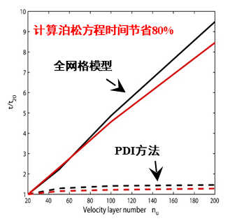 图2.1.3 PDI方法计算效率对比图 成功复演了珊瑚礁海岸波浪破碎紊动涡流场的时空变化过程,发现礁冠的存在会增强破波能量耗散率达4.5倍。模拟计算捕捉到长江口北槽下段涨急与涨憩之间存在的Kelvin-Helmoltz涡,发现Kelvin-Helmoltz涡会增强垂向紊动并加速盐淡水混合。