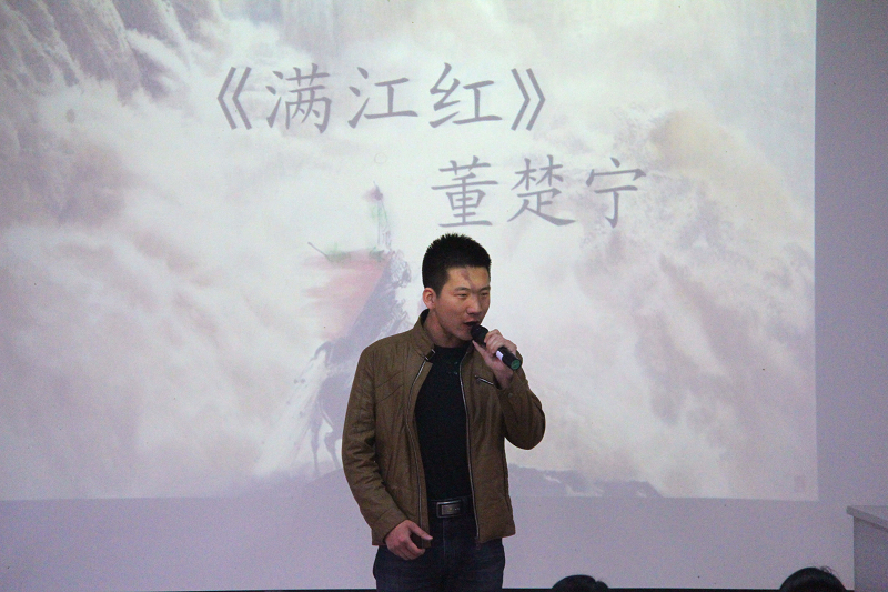 接下来,“朗文诵心”心灵美文朗诵比赛正式开始,现场可谓高手云集,竞争异常激烈,无论是朗诵内容,舞台效果,还是衣着形象等,每一位选手都进行了精心的准备。2013级港航2班的周浩男同学第一个出场,以《梦里水乡》为背景音乐,用温润细腻的声音,带我们走进了《诗意的江南》;随后港航3班张壮同学,用浑厚的嗓音,以散文化的方式朗诵了《静静地,行走在时光的深处》;更有港航4班的董楚宁同学,慷慨激昂地朗诵了岳飞的《满江红》,把比赛推向了高潮;之后,海洋班的苏轮、邓康平同学,港航1班的黄可昕、蔡嘉同学,港航2班的魏嘉琪、王艺铮同学还以双人朗诵的方式为我们带来了各自的朗诵作品。比赛现场,选手们或娓娓道来,或慷慨激昂,或温情脉脉,或激情洋溢,每个人都用自己独特的方式传递出港航学子对生命的热爱,对青春的歌颂,对理想的执着。