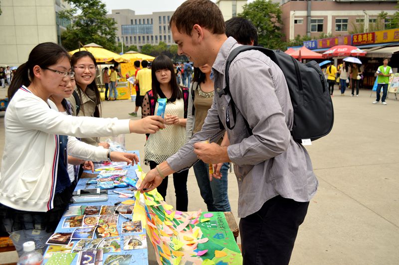 本次活动的形式很简单,只需要同学们在便利贴上写下对环保的建议或看法,并将其贴在展板的海报上即可。在活动现场,工作人员热情地向过往的同学介绍“活动金点子”创意征集活动并认真地与感兴趣的同学进行交流。随着活动的进行,越来越多的同学加入到了“金点子”的活动中来,现场的气氛很是热烈。