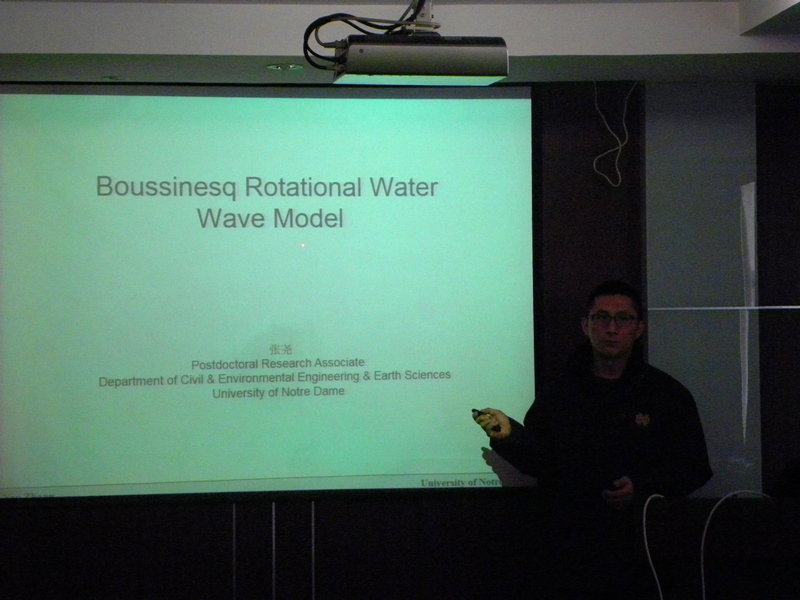 2014年12月12日上午,美国圣母大学土木与环境工程及地球科学系张尧博士来NT动漫 访问交流。张尧博士为NT动漫 师生作了题为“Boussinesq-Green-Naghdi rotational water wave model: theory and applications”的学术报告,详细阐述了其开发的Boussinesq-Green-Naghdi有旋水动力模型,并介绍了该模型在菲律宾沿海与美国新泽西州海岸灾害研究中的实际工程应用。报告后针对新模型与传统Boussinesq模型的改进程度及其在模拟水波有旋运动上的优势等问题,张尧博士与NT动漫 师生进行了热烈的讨论。