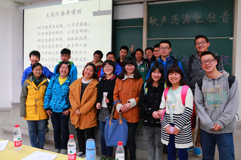 “钟灵毓秀石头城,人才蒸蔚起。。。”2015年3月25日16时,14级港航一班同学在勤学楼5112成功举办“歌声荡漾忆往昔,大哉河海奔前程”主题精品活动。此次活动主要目的是通过对校歌内涵的挖掘,加强同学们对河海百年悠悠历史以及河海精神的理解。出席活动的有NT动漫 党委书记胡忠华老师、港航一班班导师杨洁老师、港航三班班导师李欢老师、13级辅导员王玲老师以及14级辅导员季超老师。参加本活动的不仅有一班的全体同学,还有NT动漫 其他兄弟班级近60名同学。