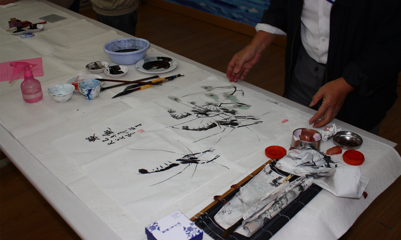 在现场书画创作的过程中,各院学生代表各显其才,用笔书写对河海的百年祝福。几位退休教师对同学们的现场书法作品逐一点评,对不少作品赞赏有加。与此同时,老师们也在宣纸上挥毫泼墨,将现场的气氛推向高潮,现场弥漫着怡人的墨香和高雅的艺术氛围。宋太炎教授笔下的虾,栩栩如生,生动曼妙,一支红梅也画得苍劲有力,疑吐芬芳,让在场的同学一饱国画风采。马文潭教授的草书让大家领略了豪放与潇洒,陈宏贲教授亲题河海校训“艰苦朴素,实事求是,严格要求,勇于探索”为河海百年献礼!