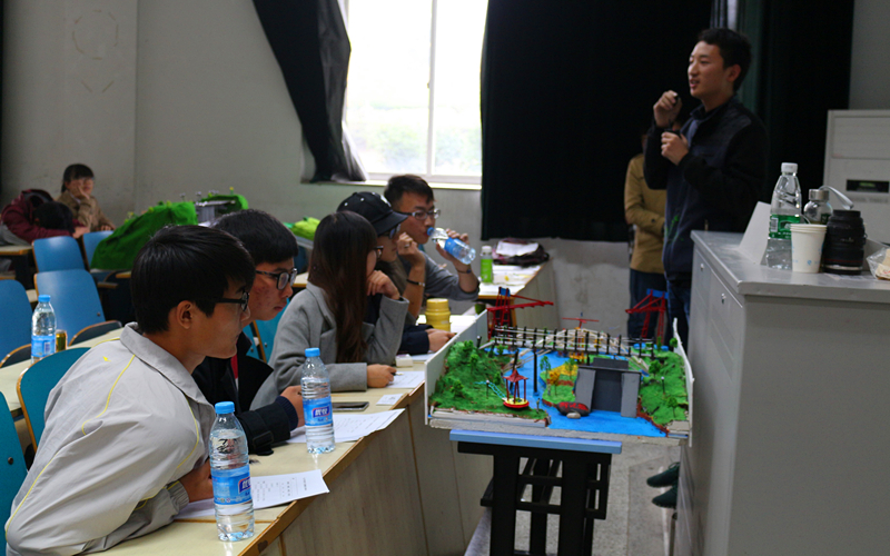 两点半,在主持人阐明比赛评分细则后,比赛正式开始。参赛选手依次上台向评委展示自己的作品,讲解作品的构思、原理、制作过程和心得感悟。评委们认真听取了选手的讲述,仔细观察作品,向选手就作品的细节方面进一步询问。比赛中涌现了相当多思维敏锐的设计者和精美绝伦的作品。林欣然组的港口模型精致而美观,充分展现了港航学生扎实的专业功底和女生的心灵手巧;土木院赵鑫元组的大坝模型充满着创意和梦想,现场的功能展示更让评委们相信这梦想的可行性;张宸豪组的模型发动机彰显着该组的深厚的机械知识积累;最后一组的水力发电试验的成功更是赢得了全场人员的掌声。无数的思维火花在这里碰撞,说不尽的青春创意在这里点亮,精彩激烈的角逐之后,比赛顺利落下帷幕。