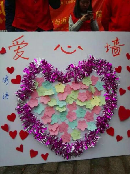 青协长期以来在“宝船社区 希望来吧”开展的公益服务项目,并希望他们可以为那里的外来务工人员子女写下一些寄语,表达他们对孩子们的祝福与期望。路人们积极响应,不时还会追问孩子们的一些具体情况。活动期间,也有学院的退休老教师们来到摊位前,对此次活动表示支持与鼓励。戴着干净的眼镜,拿着洁净的手机离去的同时,爱心墙上也留下了满满的、真诚的祝福,其中有在校学生,有路过的爷爷奶奶、叔叔阿姨,也有同龄的孩子。在活动还未正式结束时,爱心墙已经布满了纸条,志愿者们将在活动结束后收集好送到孩子们的手中,将爱心传递给孩子们。