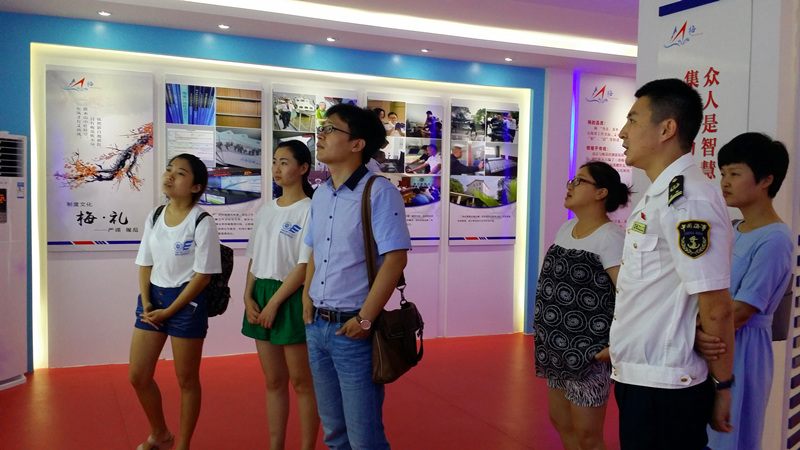 7月13日上午九点,在南京海事局团委书记刘育莎的带领下,在两位指导老师NT动漫 团委书记朱钰、NT动漫 14级辅导员季超的陪同下,实践团队驱车来到位于长江边的梅山海事处,经刘书记介绍后,为前来办理业务的船员派发问卷。在船员办理好业务后,团队成员引导船员填写问卷,并主动询问船员对江豚的看法。十一点时,实践团队结束问卷调查活动,在刘书记的带领下,参观梅山海事处工作展厅。过程中,队员结合的江豚生存环境,针对船舶溢油提出问题,工作人员一一耐心地给予解答。