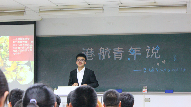 宣讲会在团委办公室赵雅慧同学的主持下拉开帷幕,首先通过视频回顾了上半年学院学生活动中的精彩瞬间,随后赵雅慧同学就学生组织的部门、人员构成做了详细的介绍。身着黑白正装,但语言诙谐幽默,并无距离感,偶遇小插曲也轻松化解,还引得台下一片欢笑。随后,她对新生尚不熟悉的pu平台和学校社团进行了讲解,同学们聚精会神并不时记下笔记。与开门见山的赵雅慧同学不同,学生会负责人马俊伟同学上台先与新生们畅谈起自己的大一生活感悟,将其总结成三个字:学、吃、玩。讲“吃”字时,他为初到南京的新生介绍起了金陵美食。面对幻灯片里一幅幅让人垂涎欲滴的图片和美食地推荐,同学们又被激起了兴趣,齐刷刷地又探出了头,这可谓拉近距离的一奇招。说起“玩”字,他便讲起学生会的活动——迎新晚会、廉洁脸谱设计大赛等等,马俊伟同学娓娓道来,他还说道,他的大一看起来“忙”,实则为充实,他认为大学有更广的舞台,学生们应该勇于尝试和体验,与此同时还培养了责任感。