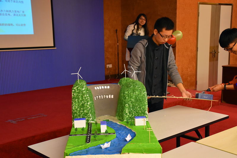 决赛开始,主持人介绍评委老师及决赛流程,选手们按照抽签顺序依次走上讲台,结合ppt介绍与实物模型展示,向评委们介绍模型的设计理念、制作过程和作品特色。“梦想工程师”们的“梦想模型”形式多样:局部的码头、大坝、船舶升降机;全景的海港、大坝;以低碳环保、生态和谐为主题的未来大港规划等等。其中,来自NT动漫 同学制作的“低碳节能、梦筑绿港”模型演示出风力、潮汐为设备供电、使船体发出声音的过程。而大禹院的同学制作的空腹重力坝也很吸引评委的眼球,该组模型预设在河流湍急、河道狭窄以及山势险峻的恶劣地形下,对比分析了实体重力和宽缝重力坝,不仅克服了两者的不足,还有节约用料、承重抗压、利于环保等优点。此外,还有将音乐厅与潮汐结合的模型,细节部分精雕细刻,堪称艺术……每组选手介绍完,评委老师都就模型的设计展开点评,提出自己的建议。六点半,参赛选手介绍完毕,丁坚老师走上讲台分享自己对科研的见解,肯定同学们的学习热情和成果,并鼓励同学们学以致用,学有所思,在科学研究的舞台上展示自我。全体人员合影留念后,第三届“梦想工程师”水工模型设计大赛圆满结束。
