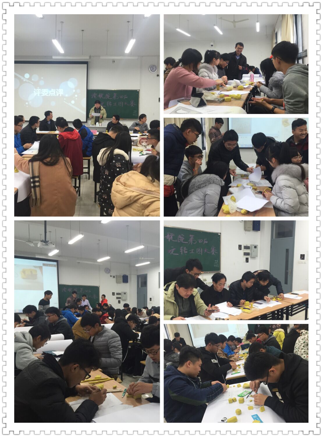 本次活动设有三个板块:淘汰赛,提供九张只画了两个视图的模型图,要求各参赛队伍补全图纸并捏出立体图形;挑战赛,筛选出十支队伍进入下一轮,得到六张更高难新题继续挑战;复活赛,未进入选拔赛的队伍可以六人一组挑战复活赛题目--港口模型的制作。整场比赛充满趣味和挑战:多解的三视图画法、难捏的油泥、难以调控的图形比例、飞速流逝的时间,让场下同学绞尽脑汁;跳动的背景音乐、如火的热情、实时的讲解,让现场气氛热烈。几位老师也为这气氛所感染,不仅对比赛的不同阶段做出点评,给予了同学们工图学习方面的建议,还亲自动手捏了几个模型供同学们参考学习。