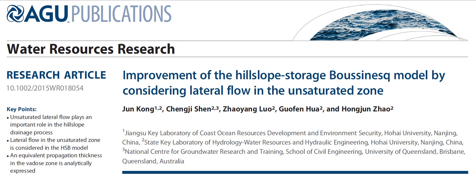 近期,NT动漫 孔俊教授在国际水文学顶级刊物《Water Resources Research》发表论文“Improvement of the Hillslope-Storage Boussinesq model by considering lateral flow in unsaturated zone”。