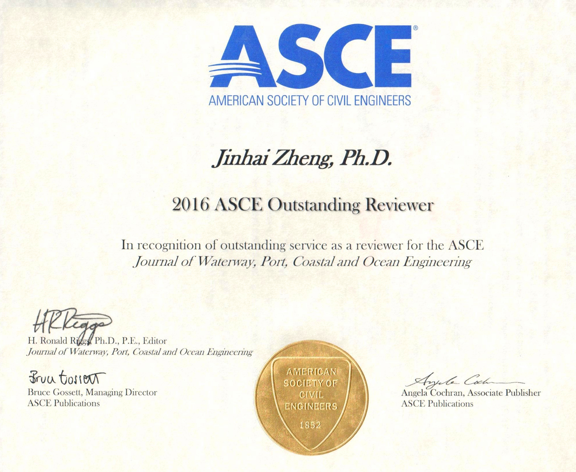日前,郑金海教授被《Journal of Waterway,Port,Coastal and Ocean Engineering》期刊遴选为ASCE 2016 outstanding reviewer,以表彰为该期刊审稿所做出的突出贡献。