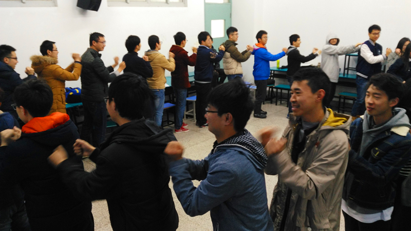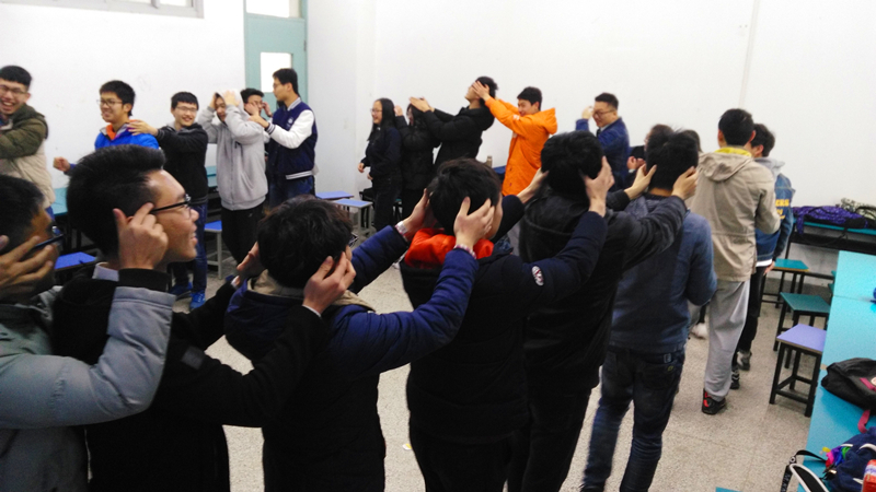 “成王败寇”游戏需要同学们分小组,合作完成任务,完成时间短的小组获胜。主持人把同学们分成两组,并随机选定小组长。各组经过十分钟的讨论后,比拼正式开始,首先是大象鼻子转圈,15圈之后参赛者已经晕晕乎乎,把任务转移到第二环节,背部猜字,小组成员使出浑身解数,靠着默契很快猜出了题目文字,第三环节的蒙眼猜物更是把比赛推向了高潮。最后小组成员围成一圈,编花篮跳,完成了比赛。