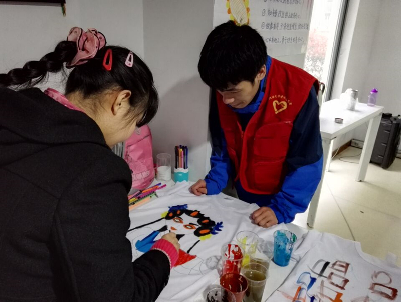 志愿者们到了宁馨阳光家园,一个小队留在宁馨阳光家园与孩子们一起完成文化衫彩绘,一个小队前往附近人流量较多的地带宣传世界水日相关知识。在宁馨阳光家园内,志愿者们与孩子们一一配对,与孩子们交流水文化、水资源保护等小知识,并引导孩子们用水彩、画笔等在文化衫上创作出自己对水的理解和感悟。社区街道上,志愿者门向市民介绍世界水日,讲解生活中的惜水、护水小妙招,并邀请市民在世界水日的宣传横幅上签名。