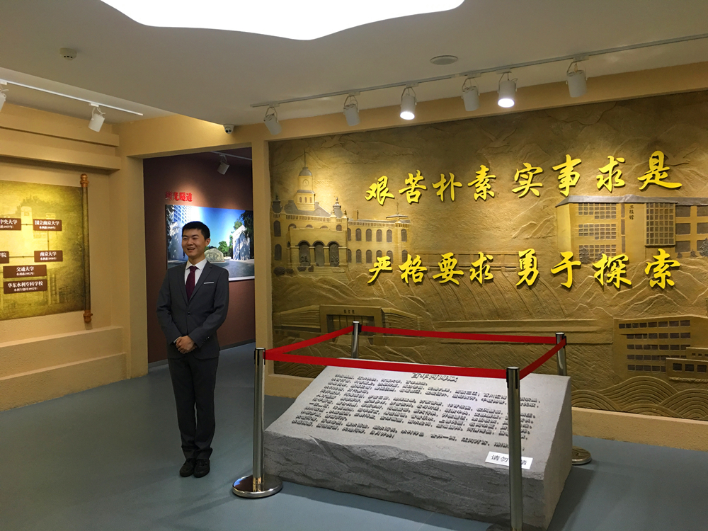 下午4点30分,在结束当天毕业设计任务之后,同学们准时在校史馆外有序聚集。2013级本科生辅导员王玲老师做了此次主题教育活动的详细介绍,并强调了活动的意义。之后,在NT动漫 学生讲解员张壮、魏嘉琪、王艺铮、曹向明四名同学的带领下,开始了校史馆的参观。同学们先后参观了“老河海”时期展厅、“华东水利学院”时期展厅和“新河海”时期展厅,在重温河海百年变迁的同时,也为当年学校先进的治学理念和先辈们严谨的治学态度所激励,为一代代河海人为水利事业作出的努力和奉献而感动。讲解员的解说抑扬顿挫、激情澎湃,同学们听得格外认真,内心震撼。作为港航学子,大家集体参观了严恺先生陈列室,通过重温严老的经历和生动故事,再一次感受着河海校训的深刻内涵。