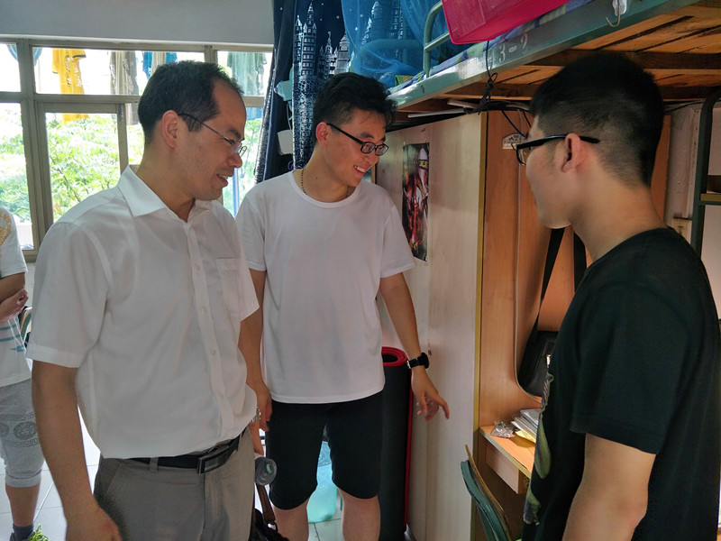 郑金海院长一行来到2015级男生宿舍,首先参观了各个宿舍的卫生环境和设施条件。看到宿舍窗明几净,学生床铺整齐,书柜有序,院长、书记表扬了各个宿舍的卫生工作,并鼓励同学们要保持宿舍卫生,养成良好的生活习惯。针对宿舍里设施条件的一些问题,胡忠华书记叮嘱同学们及时反映情况,主动寻求解决,消除安全隐患。郑院长亲切地与同学们交流学习上的一些问题,了解同学们的学习情况和困难,督促同学们努力打好学习基础,扎实掌握基本功,把课本和老师讲解的内容吃透,再在此基础上进行不断创新。交流中,院长提出,同学们作为课程教学的主体,对于目前培养方案的课程设置、讲授内容等有一些想法或者改进建议可以及时反馈给学院,学院也在不断研讨和优化。院长、书记看到有些同学在自学法语,表示十分赞赏,同时鼓励同学们多储备知识,多参加实践,为以后走出学校、走向工作岗位做好准备。姜海霞副书记也对学生内务工作以及体育健康工作提出了意见和建议。