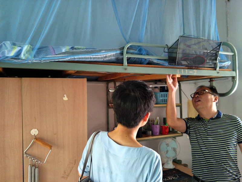 郑金海院长一行来到2015级男生宿舍,首先参观了各个宿舍的卫生环境和设施条件。看到宿舍窗明几净,学生床铺整齐,书柜有序,院长、书记表扬了各个宿舍的卫生工作,并鼓励同学们要保持宿舍卫生,养成良好的生活习惯。针对宿舍里设施条件的一些问题,胡忠华书记叮嘱同学们及时反映情况,主动寻求解决,消除安全隐患。郑院长亲切地与同学们交流学习上的一些问题,了解同学们的学习情况和困难,督促同学们努力打好学习基础,扎实掌握基本功,把课本和老师讲解的内容吃透,再在此基础上进行不断创新。交流中,院长提出,同学们作为课程教学的主体,对于目前培养方案的课程设置、讲授内容等有一些想法或者改进建议可以及时反馈给学院,学院也在不断研讨和优化。院长、书记看到有些同学在自学法语,表示十分赞赏,同时鼓励同学们多储备知识,多参加实践,为以后走出学校、走向工作岗位做好准备。姜海霞副书记也对学生内务工作以及体育健康工作提出了意见和建议。