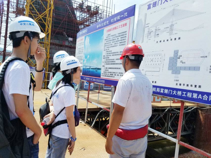8日上午,在陈岱杰处长的安排下,调研团前往中交二航局富翅门大桥第A合同段作业现场进行参观。简单地穿戴了安全设施后,便在技术负责人刘洪豹的带领下上了桥。刘工对于大桥建设环境方面的情况介绍更加专业,提到了钻井过程中用于裹挟碎石的泥浆增稠剂可能造成的污染,施工现场和生活区的6S管理标准等问题。刘工也以“过来人”的身份分析了现在的水利行业的形势,他指出,女生在施工单位就业受限较大,但可以在质检等部门发挥才能,而未来的就业与发展也可以不局限于此,队员们也对自身的发展与规划有了更深刻的认知,对专业学习的热情也大大提高。
