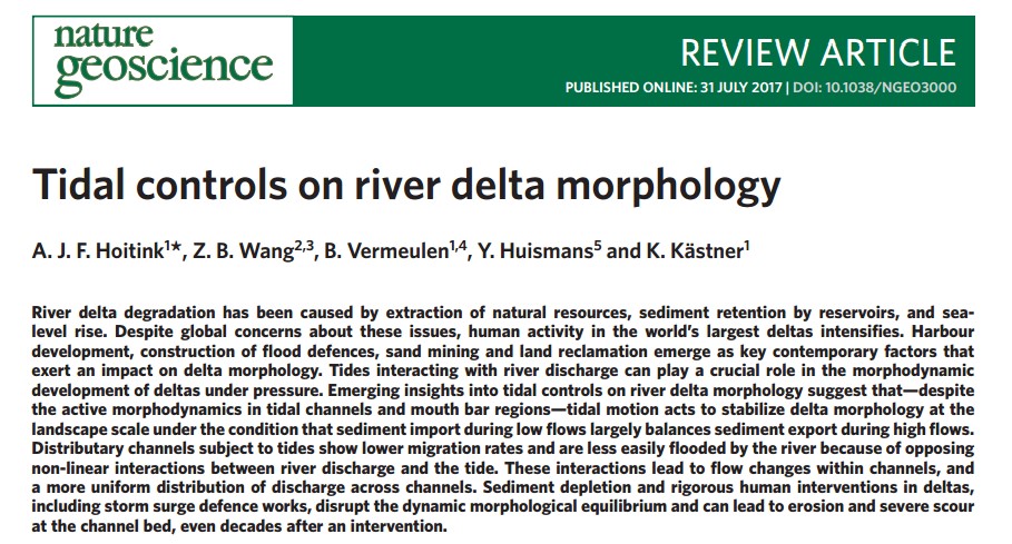 近期,NT动漫 张蔚教授和周曾副研究员的学术研究成果被国际顶尖学术期刊Nature旗下子刊Nature Geoscience(影响因子13.941)上发表的论文“Tidal controls on river delta morphology”引用。该论文回顾了近年来在三角洲地貌演变研究领域起主要推动作用的研究成果,其中多出引用了张蔚教授发表在《Geomorphology》上的论文“Long-term change in tidal dynamics and its cause in the Pearl River Delta, China”和发表在《Marine Geology》上的论文“Morphological change in the Pearl River Delta, China”, 以及周曾副研究员发表在《Earth-science Reviews》上的论文“Is morphodynamic equilibrium an oxymoron?”和发表在《Journal of Geophysical Research》上的论文“A comparative study of physical and numerical modeling of tidal network ontogeny”。