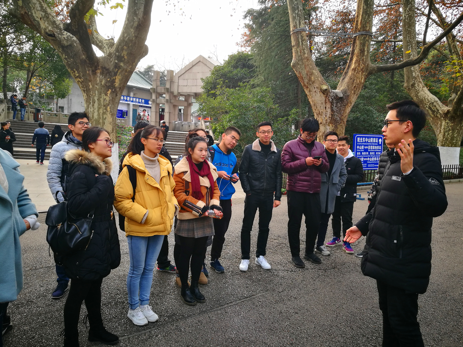 在攀登陵寝的途中,赵康同学为大家详细讲解了陵寝的布局寓意和建设沿革。到达陵寝后,同学们依次在纪念堂进行了拜谒,并聆听纪念堂的工作人员讲述了孙中山先生的革命历程。之后,在纪念堂前,大家齐声朗诵了《和平宣言》,表达了对战争的反思和对世界和平的期望。