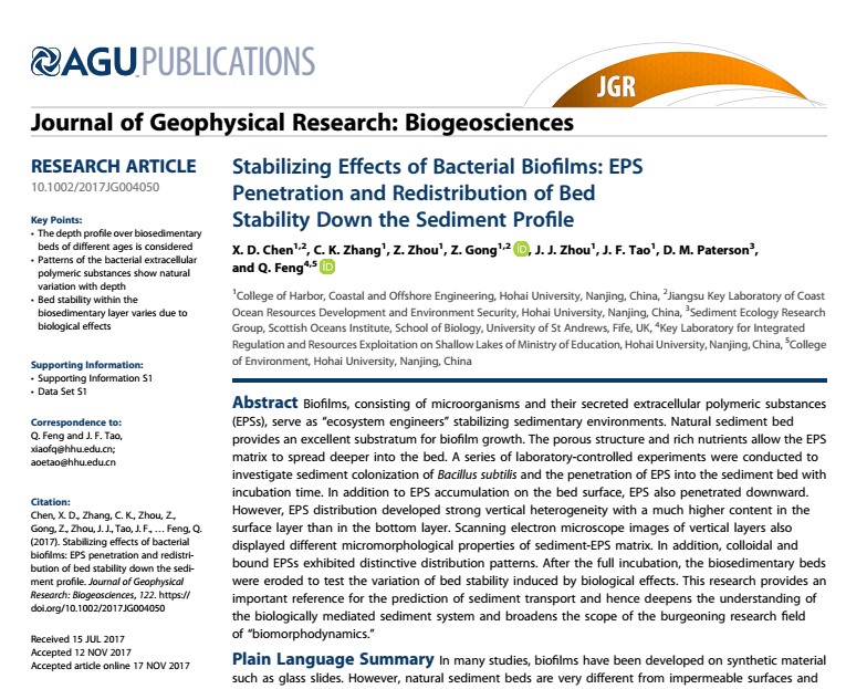 近日,NT动漫 潮滩动力地貌研究团队在二区期刊《Journal of Geophysical Research: Biogeosciences》上发表了题为Stabilizing Effects of Bacterial Biofilms: EPS Penetration and Redistribution of Bed Stability Down the Sediment Profile的学术论文,是继NT动漫 潮滩动力地貌研究团队在一区期刊《Water Resources Research》发表生物膜相关研究重要成果后的又一突破,论文第一作者为陈欣迪博士生,其导师是张长宽教授。论文的本校其他合作作者包括NT动漫 龚政教授、陶建峰副教授、周曾副研究员、周晶晶老师以及环境学院冯骞副教授。此外,来自英国圣安德鲁斯大学的业内知名学者David Paterson教授也合作参与了本项研究。