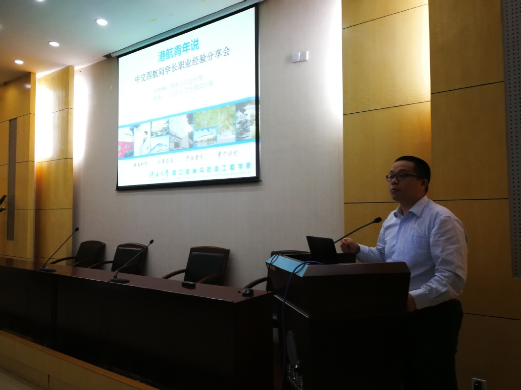 2018年9月8日,港航青年说系列之中交四航局学长经验交流会于NT动漫 闻天馆113举办。本次交流会邀请到了我校95届港航专业毕业校友、中交四航局珠海公司总经理关秋枫,03届工程管理专业毕业校友、三公司人力资源部经理姚荣与参会同学们分享了自己的工作经验。中交四航局组织部部长、人力资源部经理贺朝晖,港湾设计院咨询发展中心经理郑伟等四航局领导,NT动漫 就业指导中心王方主任,NT动漫 姜海霞副书记,15级本科生辅导员季超老师也出席了本次活动。