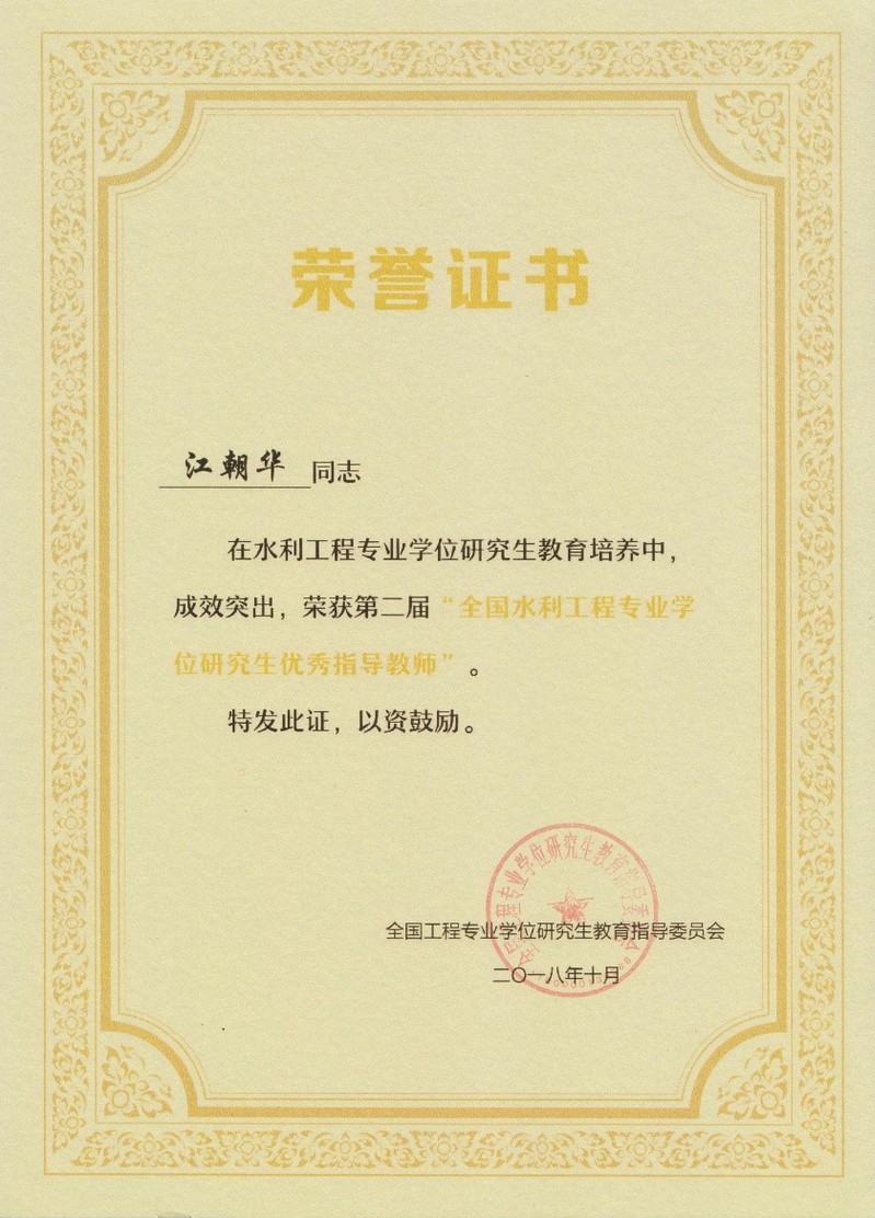 近日,全国工程专业学位研究生教育指导委员会公布了第二届“全国水利工程专业学位研究生优秀指导教师”获奖名单,NT动漫 江朝华老师成功入选。