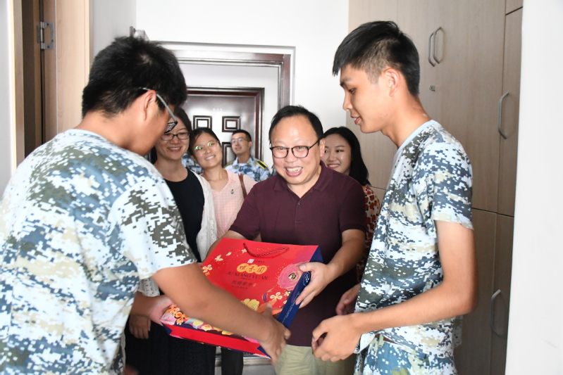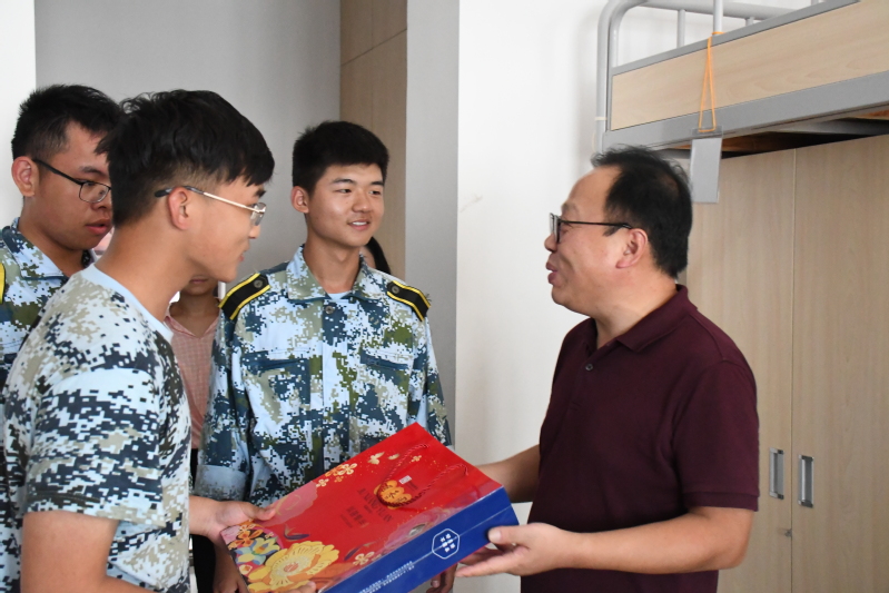 2019年9月12日,NT动漫 党委书记胡忠华、副书记姜海霞在2018级辅导员顾钰恒、2019级辅导员廖芳艺陪同下来到江宁校区教学区23舍和24舍,亲切慰问了军训中的2019级新生并赠送了学院精心准备的月饼,为新生们带来了中秋祝福。