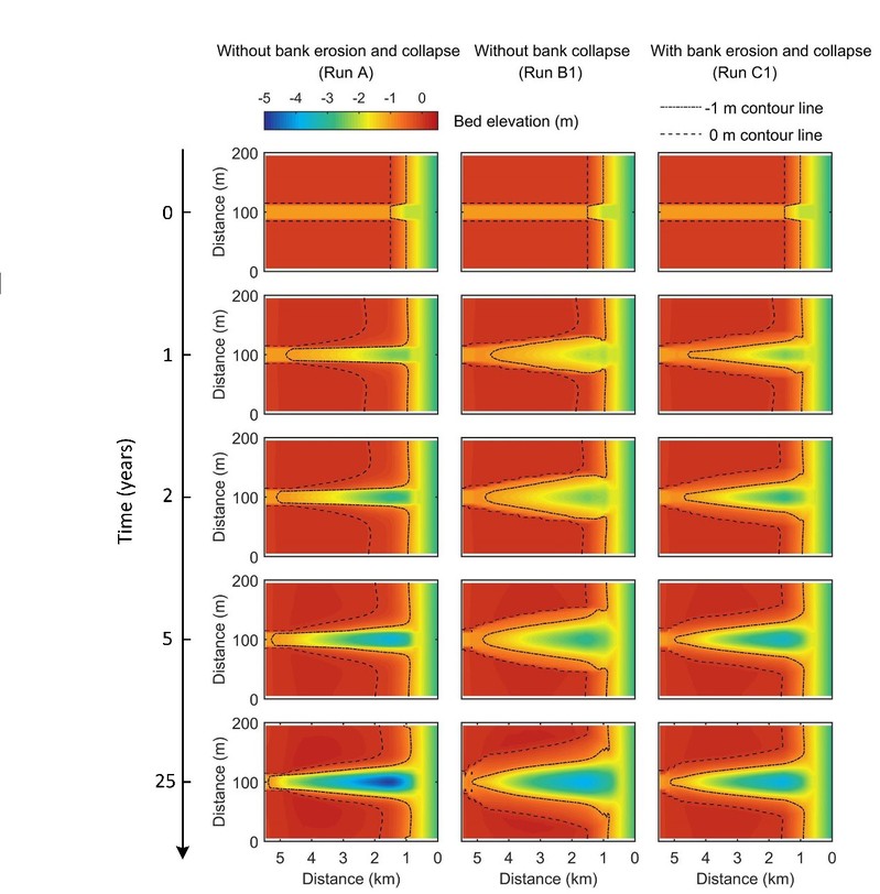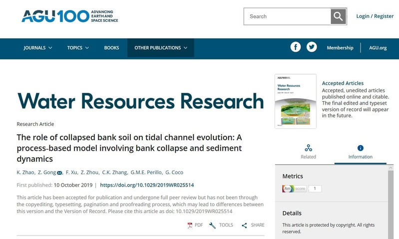 近日,NT动漫 潮滩动力地貌研究团队博士生赵堃在国际权威期刊《Water Resource Research》(一区Top, 2018年影响因子4.36)上发表了题为“The role of collapsed bank soil on tidal channel evolution: A process-based model involving bank collapse and sediment dynamics”的学术论文,是继该团队在知名刊物《Geomorphology》发表岸壁坍塌对潮沟拓宽贡献研究后的又一突破。论文第一作者为NT动漫 赵堃博士生,合作作者包括龚政教授、周曾教授、张长宽教授,以及华东师范大学徐凡博士、阿根廷海洋研究所G. M. E. Perillo教授和新西兰奥克兰大学Giovanni Coco副教授。