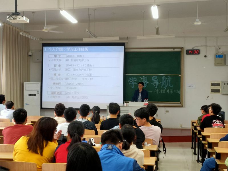 苏敏老师对自己的主要研究方向与课题——河口分汊格局自适应性调整机制研究进行具体阐述并展示河口分汊模型具体解读该研究课题,引起同学们的激烈反响。
