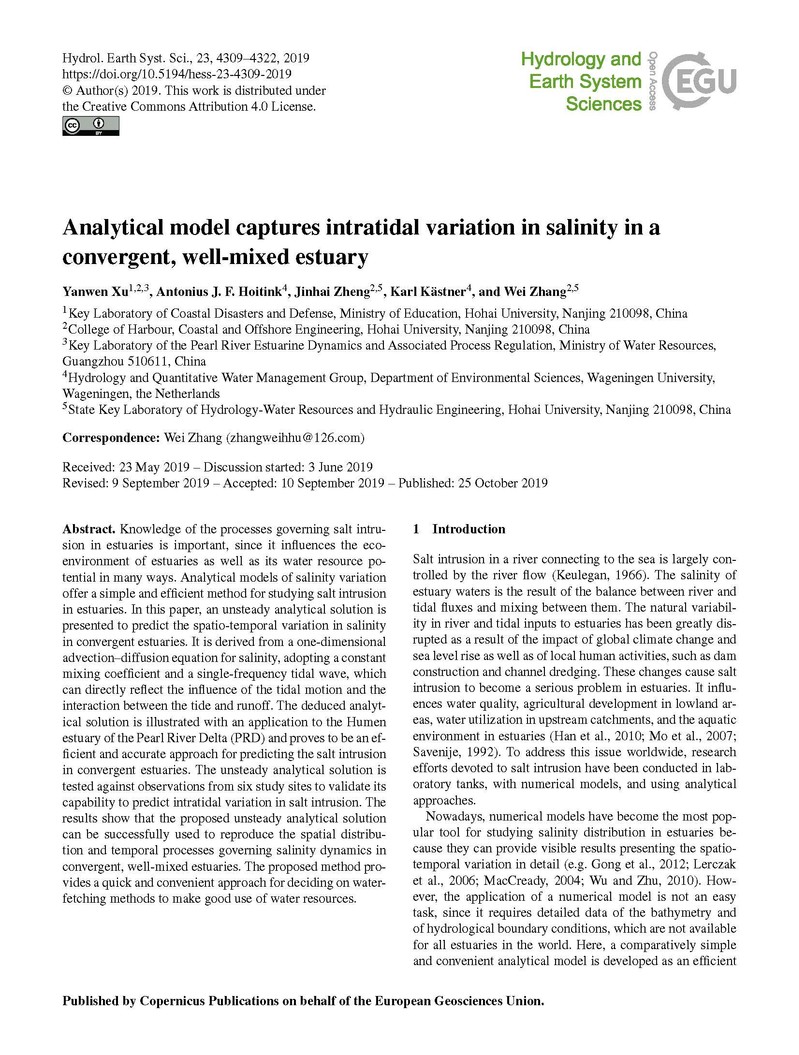 近日,NT动漫 海岸及海洋工程研究所徐龑文博士后和张蔚教授(通讯作者)在中科院一区国际学术期刊《Hydrology and Earth System Sciences》上发表高质量研究论文“Analytical model captures intratidal variation in salinity in a convergent, well-mixed estuary”。此研究是由NT动漫 张蔚教授研究团队领衔,与荷兰瓦赫宁根大学环境科学系Hydrology and Quantitative Water Management Group荷兰和德国学者组成的研究团队合作完成。