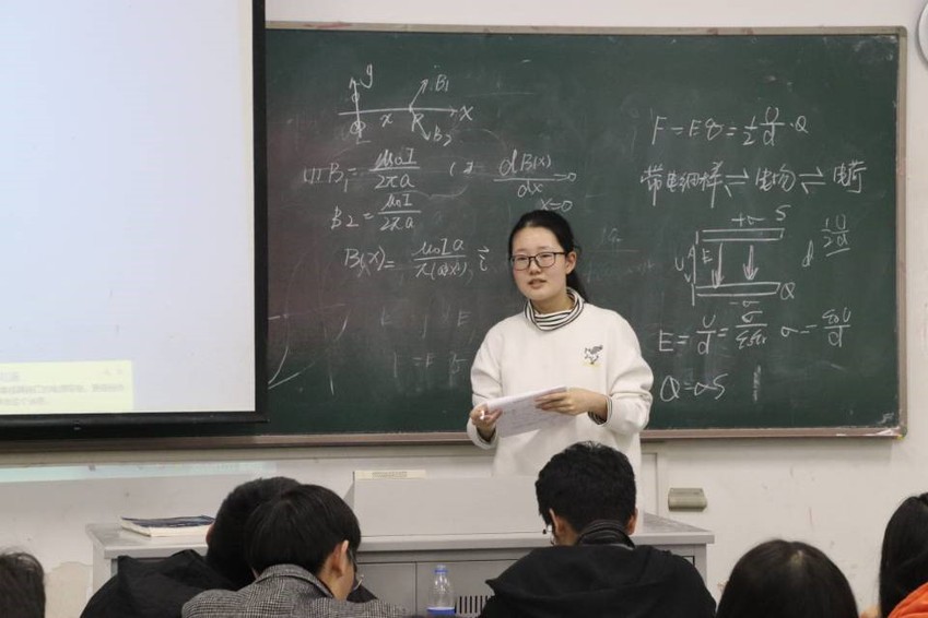 郑湘译结合课本例题和自测试题为同学们总结了动生电动势和感生电动势大小、方向的判断方法,并提醒同学们熟记麦克斯韦方程组。朱晋对试卷进行剖析,分别从电学和磁学展开讲解,她提出高斯定理和场强环路定律是电学的重要考点,强调磁场在真空中和在磁介质中的本质区别,并向同学们介绍了电磁感应相关题型的解题思路。