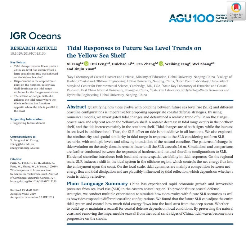 近日,隶属海岸灾害及防护教育部重点实验室(NT动漫 ),(Key Laboratory of Coastal Disaster and Defence (Hohai University), Ministry of Education)的冯曦老师携研究生冯辉、李慧超等在国际学术TOP期刊《Journal of Geophysical Research: Oceans》上发表高质量研究论文“Tidal responses to future sea level trends on the Yellow Sea shelf”。该论文阐明了复杂海岸带环境下,海平面上升与潮能演化之间的动态规律,首次界定了在中国特有的开放式海岸条件下,近岸潮能演变规律由线性形态到非线性形态的零界位置。同时,指出了在刚性和柔性护岸不同条件下,黄海大陆架近岸潮能应对海平面上升的自适性。该论文反映了平行岸线的前进潮波与垂直岸线的类驻波潮波与不同护岸之间的组合关系;从运动机制与动力机制两方面分别揭示了柔性护岸与刚性护岸工程对近未来(100年间)潮能发展的状态。该成果不仅具有重要的理论意义,而且对目前我国的生态护岸工程也有广泛的现实借鉴作用。
