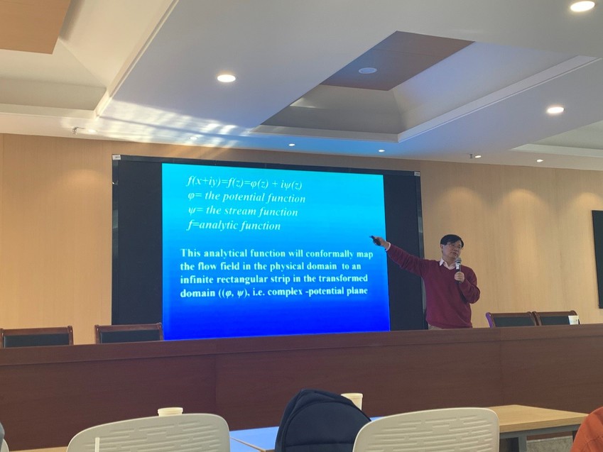 来自英国布拉德福德大学的郭亚昆教授作了题为“Computations of free surface flows in open channel(明渠水流的计算)”的学术报告。郭教授详细介绍了重力作用影响下的自由表面水流(Gravity-affected free surface flows)在水利工程中的发生条件,并且说明了用传统的势流理论来求解带自由表面的重力流时的难点。针对边界条件非线性和自由表面假设的局限,郭教授提出了改进的势流理论,创新地通过函数与流线流场的关系,将相关方程转换,即可对带自由表面的重力流进行数值求解。最后,郭教授展示了利用这种方法在实际水利工程中的运用与计算结果。