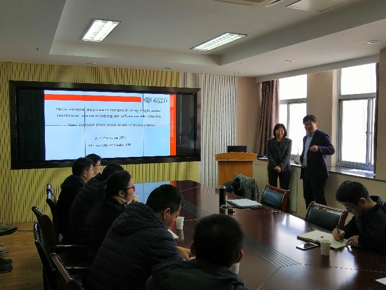本次学术交流报告中,臧教授以“New simple approach for predicting nonlinear wave loading on offshore wind turbine foundations”为题,首先介绍了研究非线性波浪的重要性,其次重点讲解了一个大型港池物理模型试验,对聚焦波(Focus Wave)作用下圆柱体的受力情况进行了展示,对线性波浪力与高阶波浪力之间的关系进行了分析。然后,臧教授还介绍了利用不同数值模型对试验进行模拟的结果。最后,臧教授还分享了她本人的求学工作经历、英国巴斯大学概况等。参会教师、同学们与臧教授围绕港池物理模型试验、圆柱体受力分布、数值模型运用等关键问题展开了热烈讨论。