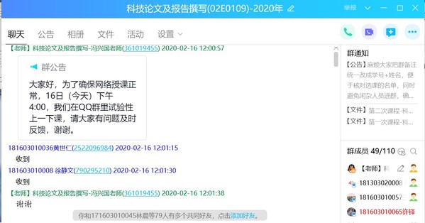 信息技术与现代教育的深度融合是教与学的改革创新。充分利用线上即时教学优势,港航师生实现了五湖四海同时连线,因疫情相隔千里的远程教学,在线上课堂上又热闹了起来。主讲《基础工程》的庄宁老师和黄挺老师在线上直播平台实现了配合默契的“一同”授课;主讲《科技论文与研究报告撰写》的冯兴国老师通过QQ直播带领着来自NT动漫 、水电院、农工院等多个学院以及与南京水利科学研究院联合培养的共90余名研究生学习撰写科技论文与凝练科研题目的技能;主讲《水下机器人》的徐鹏飞老师借助腾讯会议软件让每个学生都参与线上讨论等互动环节,及时掌握教学效果;主讲《工程商务》的雷智鹢老师利用线上优势,采用了分片教学的模式进行单独授课、单独讨论和单独答疑。线上课堂形式多样,以即时影音、图文等方式对学生进行全方位的引导与解惑,不仅活跃课堂氛围,还可调动学生的学习积极性。