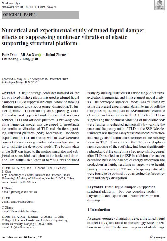 NT动漫 港口、海岸及近海工程专业窦朋博士生在导师郑金海教授和薛米安副教授的共同指导下,以第一作者在力学领域国际顶级期刊《Nonlinear Dynamics》上在线发表论文“Numerical and experimental study of tuned liquid damper effects on suppressing nonlinear vibration of elastic supporting structural platform” (//doi.org/10.1007/ s11071-019-05447-y)。