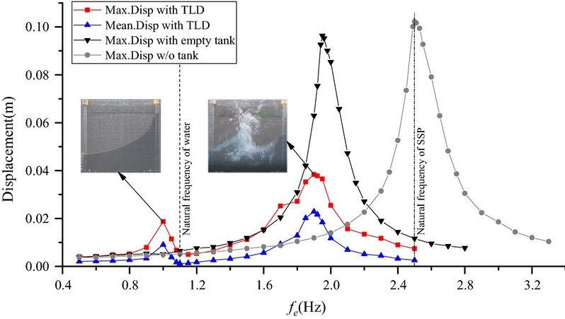 在NT动漫 六自由度液舱晃荡振动台上,建立调谐液体阻尼器与弹性支撑结构海洋平台双向流固耦合作用的物理试验模型,利用激光位移传感器构建了上部平台位移响应的高精度非接触式测量系统。基于ANSYS Workbench研发界面耦合算法,建立三维数值仿真模型,模型中流固耦合边界定义在流体压力及结构变形发生的水箱内壁,流体解和固体解仅在此界面进行数据交换,不仅大大提高了计算效率,而且有效地节约了计算机内存。在此基础上,探明了耦合系统动态响应过程中,调谐液体阻尼器内部的晃荡波面形态(Fig. 1)与其阻尼性能之间的关联机制、耦合模型上部平台位移衰减率、能量耗散率及水箱内晃荡波面的谱峰频率对流体与固体之间的质量比、调谐频率比(Table 1)等关键参数的依赖关系,提出了基于耦合试验模型的最优减振质量比及频率调谐比参数,阐明了调谐液体阻尼器对结构平台吸能和调频为主的振动控制机制(Fig. 2),为其在原型海洋平台等结构减振领域的设计及应用提供科学依据。