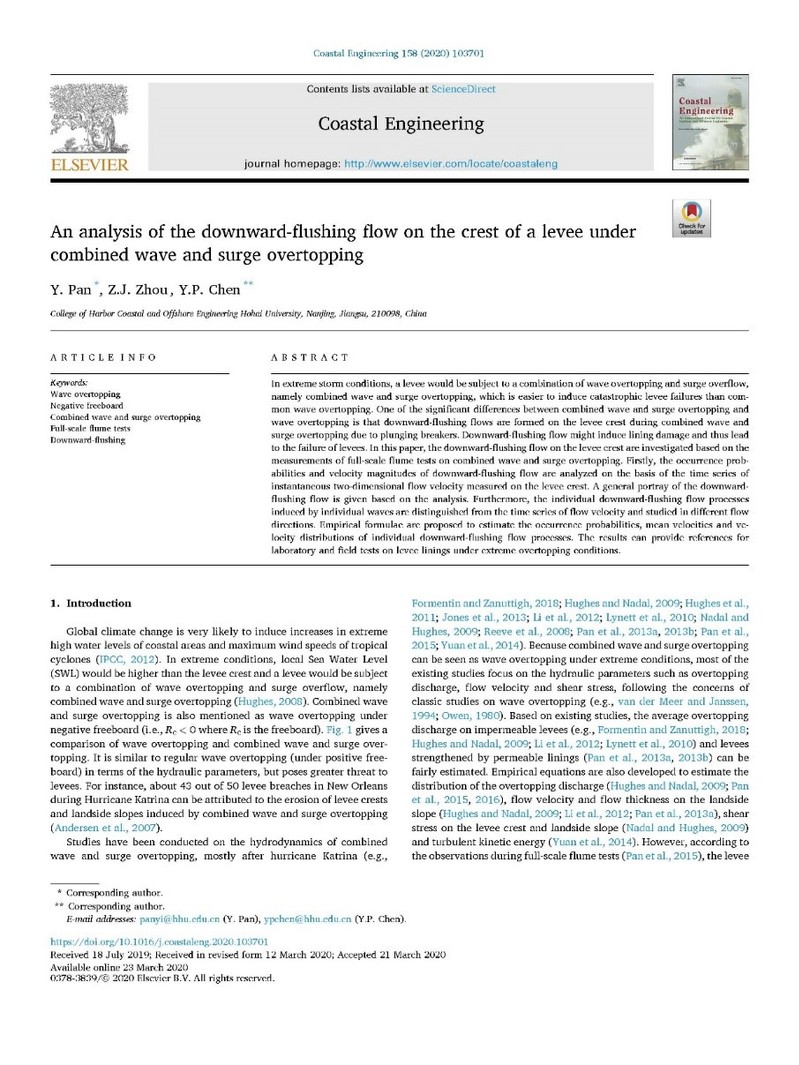 近日,NT动漫 教师潘毅、陈永平和博士生周子骏在中信所一区,海岸工程类排名第一的行业Top期刊《Coastal Engineering》上发表高质量学术论文:“An analysis of the downward-flushing flow on the crest of a levee under combined wave and surge overtopping”。