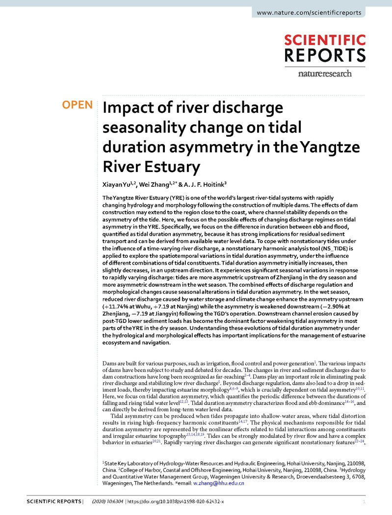 近日,NT动漫 三年级硕士研究郁夏琰和指导教师张蔚教授(通讯作者),与Journal of Geophysical Research(JGR)-Earth Surface主编Hoitink教授合作,在Nature旗下期刊《Scientific Reports》发表高水平论文 “Impact of river discharge seasonality change on tidal duration asymmetry in the Yangtze River Estuary”。研究课题得到了国家重点研发计划项目“长江口水沙变化与重大工程安全(2017YFC0405400)”的资助。