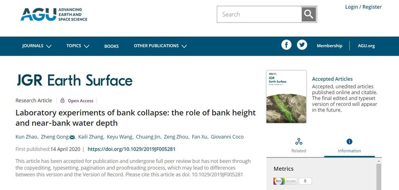 近日,NT动漫 潮滩动力地貌研究团队博士生赵堃在地貌学权威期刊《Journal of Geophysical Research: Earth Surface》(一区Top, 2019年影响因子4.25)上发表了题为Laboratory experiments of bank collapse: the role of bank height and near-bank water depth的学术论文,是继该团队在知名刊物《Geomorphology》和《Water Resource Research》发表岸壁坍塌相关研究后的又一突破。论文第一作者为NT动漫 赵堃博士生,合作作者包括龚政教授、张凯丽博士生,王客予硕士生,周曾教授,以及新西兰奥克兰大学靳闯博士,Giovanni Coco副教授和华东师范大学徐凡博士。