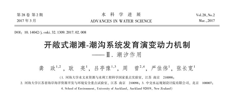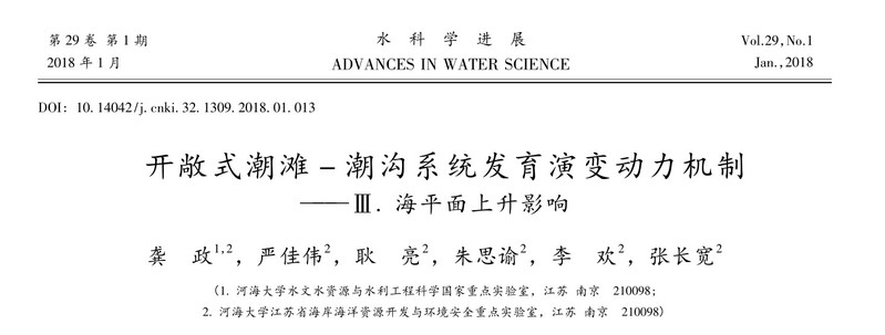 近日,NT动漫 龚政教授为第一作者于2018年发表在《水科学进展》期刊的论文“开敞式潮滩-潮沟系统发育演变动力机制——ⅲ.海平面上升影响”获评该刊的优秀论文。2018—2019年《水科学进展》共刊登论文186篇,根据论文引证指标及学术影响,经编委会推荐,共评选出20篇优秀论文(我校共2篇入选)。本优秀论文的合作作者包括李欢副教授、张长宽教授以及龚政教授指导的3名硕士生。