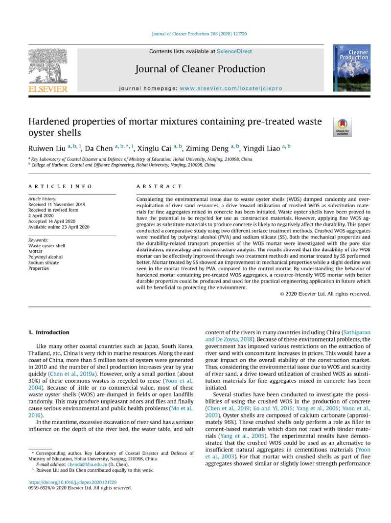 近日,NT动漫 陈达教授指导的博士研究生刘睿文在ESI工程学国际排名Top30的权威期刊《Journal of Cleaner Production》(一区Top,影响因子6.395)上发表了题为“Hardened properties of mortar mixtures containing pre-treated waste oyster shells”的学术论文。