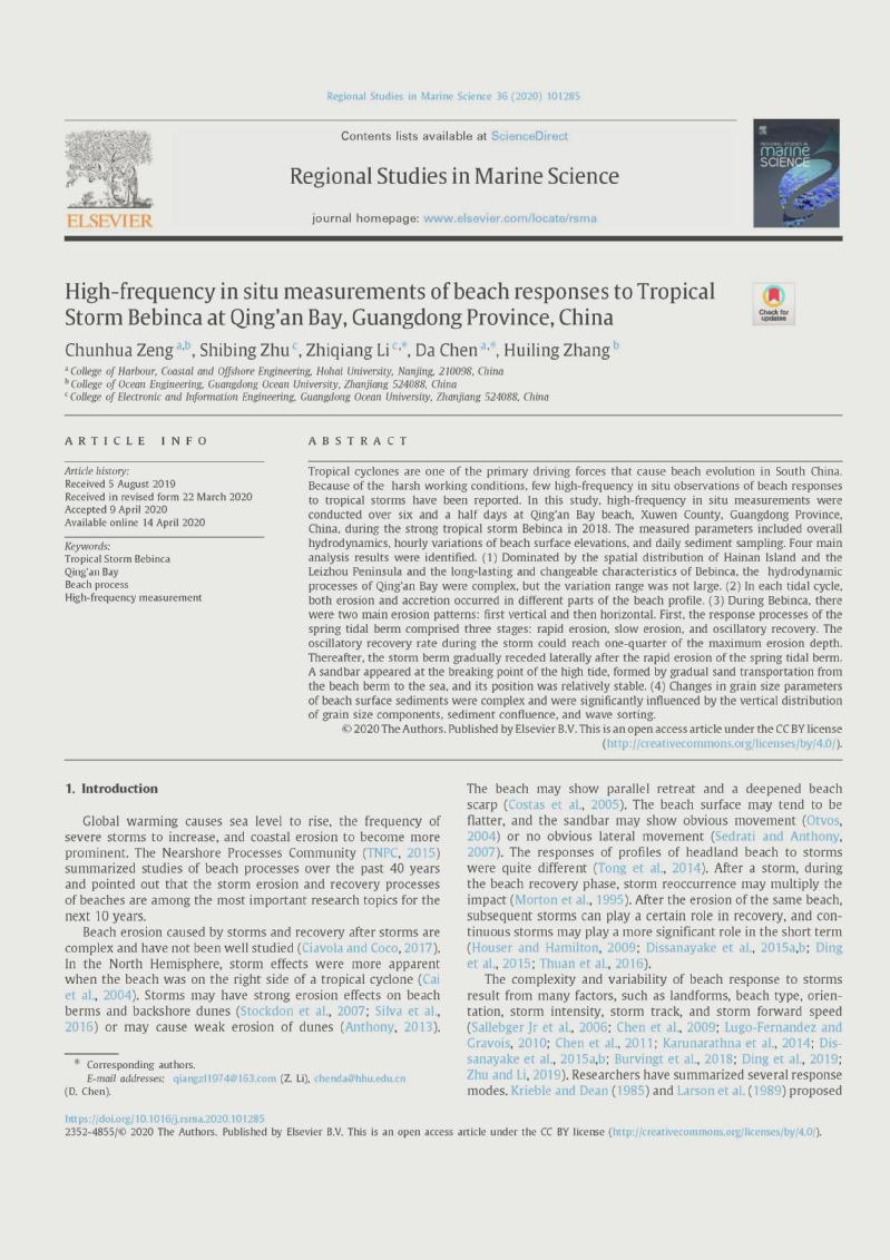 近日,NT动漫 陈达教授指导的博士研究生曾春华在《Regional Studies in Marine Science》(二区)上发表了题为“High-frequency in situ measurements of beach responses to Tropical Storm Bebinca at Qing’an Bay, Guangdong Province, China”的学术论文。