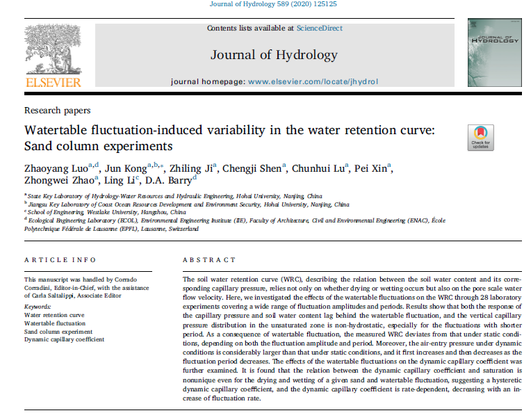 孔俊教授指导的2017级博士研究生罗照阳在《Journal of Hydrology》上发表了题为“Watertable fluctuation-induced variability in the water retention curve: Sand column experiments”的学术论文,该研究是孔俊教授团队在土壤非饱和流研究领域的又一重要理论突破。