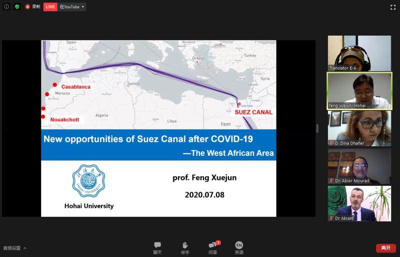 封学军教授的演讲主题为:New opportunities of Suez Canal after COVID-19—The West African Area,指出了新型冠状肺炎疫情在给苏伊士运河带来巨大挑战的同时,也带来了在船舶大型化背景下建设远东-欧洲航线针对西非区域发展的转运枢纽、港航基础设施转型升级以及加快人工智能、区块链、5G和无人驾驶船舶等新科技在航运业研发和应用等机遇。伊斯梅尔校长在会议总结中高度赞扬了NT动漫 在国际航运发展中发挥的重要作用,并对封教授在疫情期间对阿盟、特别是苏伊士运河的发展的关注以及精彩的演讲多次表达感谢。中国驻亚历山大总领馆也对封学军教授的演讲给予了高度评价,认为演讲的内容对非洲发展具有重要指导作用,从科学研究的高度很好地宣传和推广了国家“一带一路”倡议,并专门给NT动漫 发送感谢信。