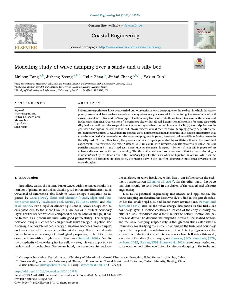 近日,NT动漫 童林龙博士后与合作导师郑金海教授、张继生教授在海岸工程类顶级期刊《Coastal Engineering》(NT动漫 A类期刊,中信所1区,影响因子4.119)上发表题为:“Modelling study of wave damping over a sandy and a silty bed”的研究论文。