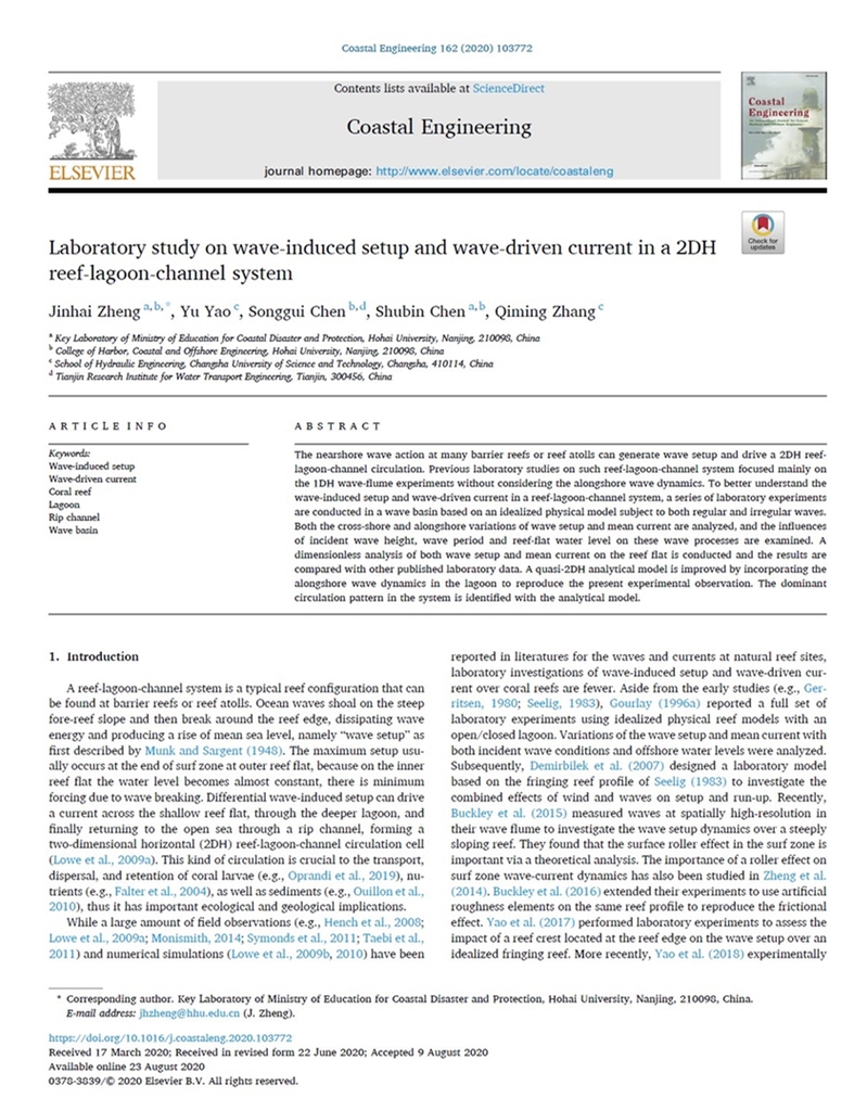 NT动漫 河口海岸综合治理与保护团队带头人郑金海教授以第一作者在《Coastal Engineering》上发表关于珊瑚礁-潟湖-裂口海岸整体物理模型试验成果,“Zheng Jinhai*, Yao Yu, Chen Songgui, Chen Shubin, Zhang Qiming. Laboratory study on wave-induced setup and wave-driven current in a 2DH reef-lagoon-channel system. Coastal Engineering, 2020, 162: 103772”。