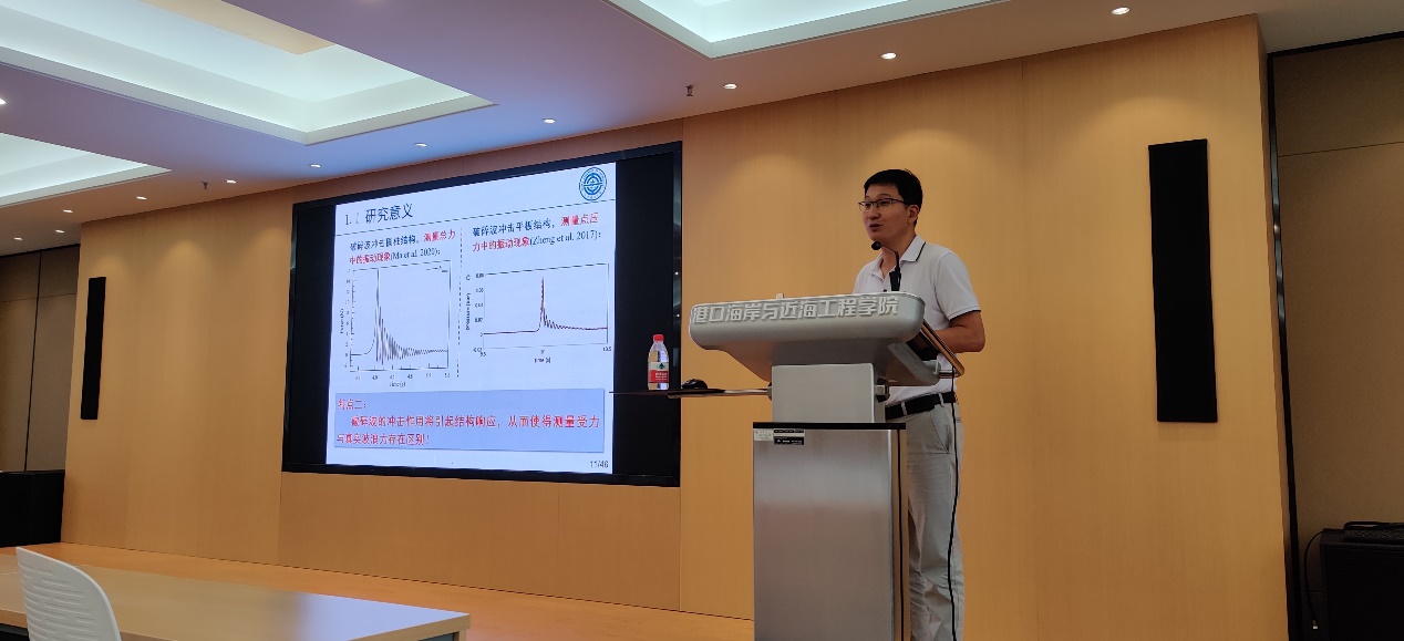 董国海教授作了题为“深海养殖网箱水动力学”的学术报告,围绕背景需求、理论构建、关键技术、实际应用和人才培养等方面,详细介绍了其带领的团队在深海养殖网箱水动力学方向所开展的系统性创新研究工作。马玉祥教授作了题为“破碎波对直立圆柱的作用研究”的学术报告,介绍了复杂破碎波面形态、结构动态响应、结构周围波面变化等新机制影响下的圆柱波浪力特性及其计算方法。报告后,两位教授和与会师生开展了热烈讨论,取得了很好的交流效果。