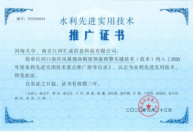 近日,水利部发布了《2020年水利先进实用技术重点推广指导目录》,由NT动漫 陈永平教授主持研发的“河口海岸风暴潮高精度预报预警关键技术”成功入选。该技术采用多要素耦合、多尺度嵌套和多数据融合手段,构建了近岸天文潮-风暴潮精细化预报模型和多层次实时修正模型,实现了河口海岸风暴潮动力过程的精细模拟和精准预报;在云平台、云集成技术支撑下,构建了云架构下的河口海岸风暴潮预报预警业务化系统,实现了风暴潮期间河口海岸综合潮位的高精度、高时效业务预报。技术成果已在江苏、上海、浙江和广东沿海水利防汛部门进行了成功应用,取得了显著的防灾减灾效益,具有重要推广应用价值。