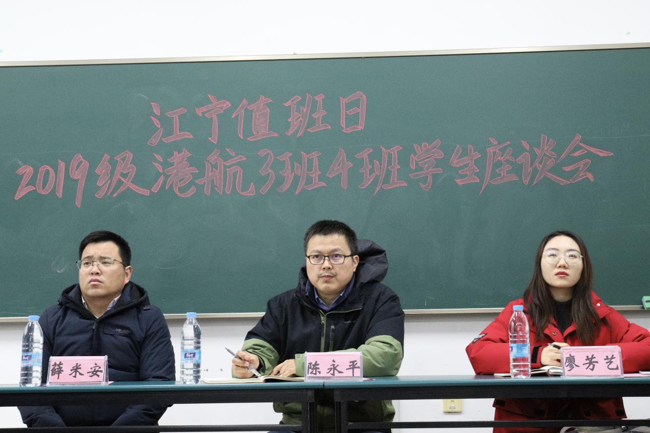2020年12月8日下午14时,江宁值班日—2019级港航3班4班学生座谈会在江宁校区励学楼A209举行。NT动漫 陈永平副院长、2019级港航4班班导师薛米安老师、辅导员廖芳艺老师出席了本次座谈会。