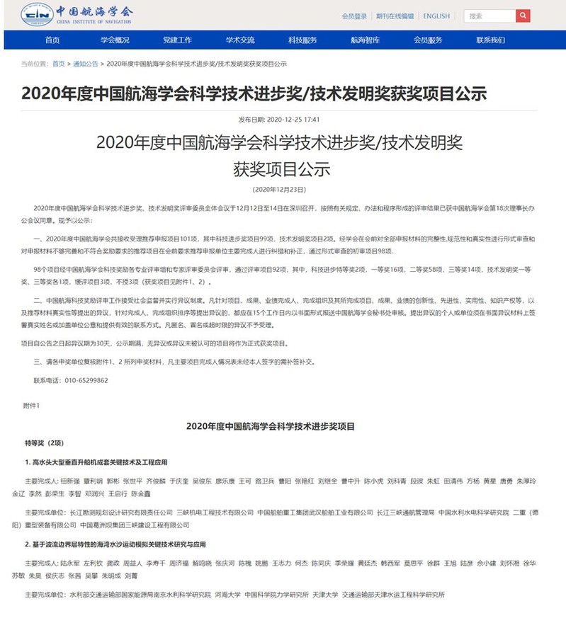 近日,2020年度中国航海学会科学技术进步奖揭晓,我校作为主要完成单位参与的《基于波流边界层特性的海湾水沙运动模拟关键技术研究与应用》获评特等奖(已完成公示)。该成果由水利部交通运输部国家能源局南京水利科学研究院、NT动漫 、中国科学院力学研究所、天津大学、交通运输部天津水运工程科学研究所等单位共同研究完成。NT动漫 龚政教授、姚鹏副教授、苏敏副研究员、张茜博士后作为技术骨干,共同参与科研攻关。